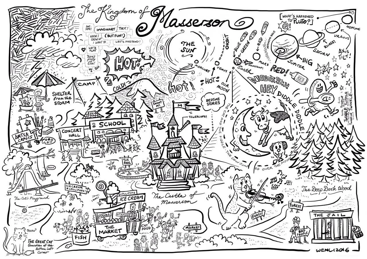 The Kingdom of Masserson is an imaginary land inspired by the playtime favourites of the artist’s young daughter. Initially drawn for the child’s entertainment (certain features are requests by the kiddo – the Cat’s Playground, the storm clouds, the solar system; the name ‘Masserson’ itself is a creation of the child), the piece eventually became a little memento of one of the most inquisitive phases of the child’s growth, overlaid with hints of a parent’s love (the provision of a shelter from the storm) and, lest we forget, a little reminder to spend more quality time with one’s kids, who invariably grow up all too quickly – ‘There’s plenty of time’ (to play, that is!).